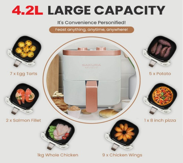 - 4.2 L capacity, Drawer-type frying basket - Enough cooking space to house a whole chicken too